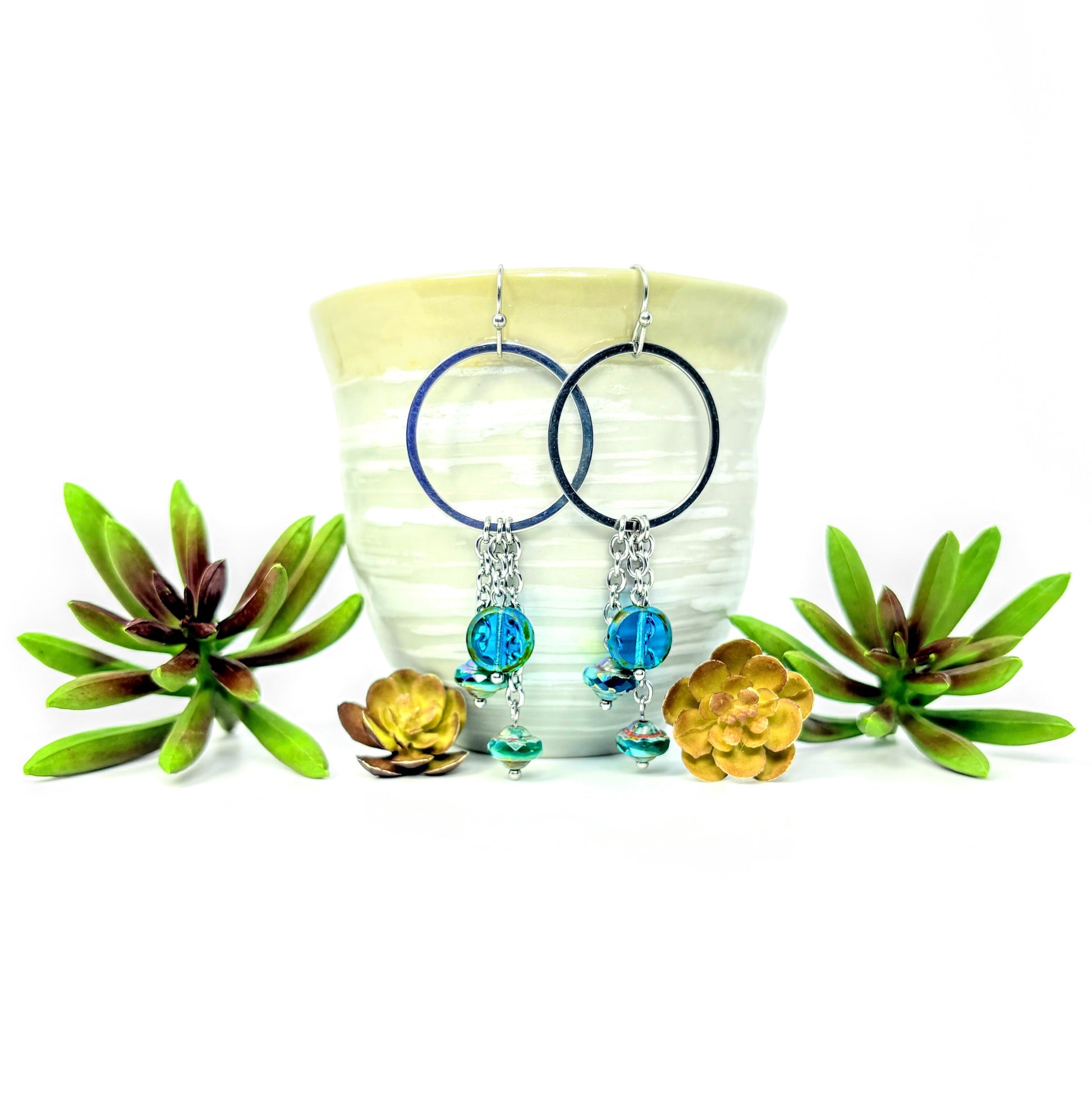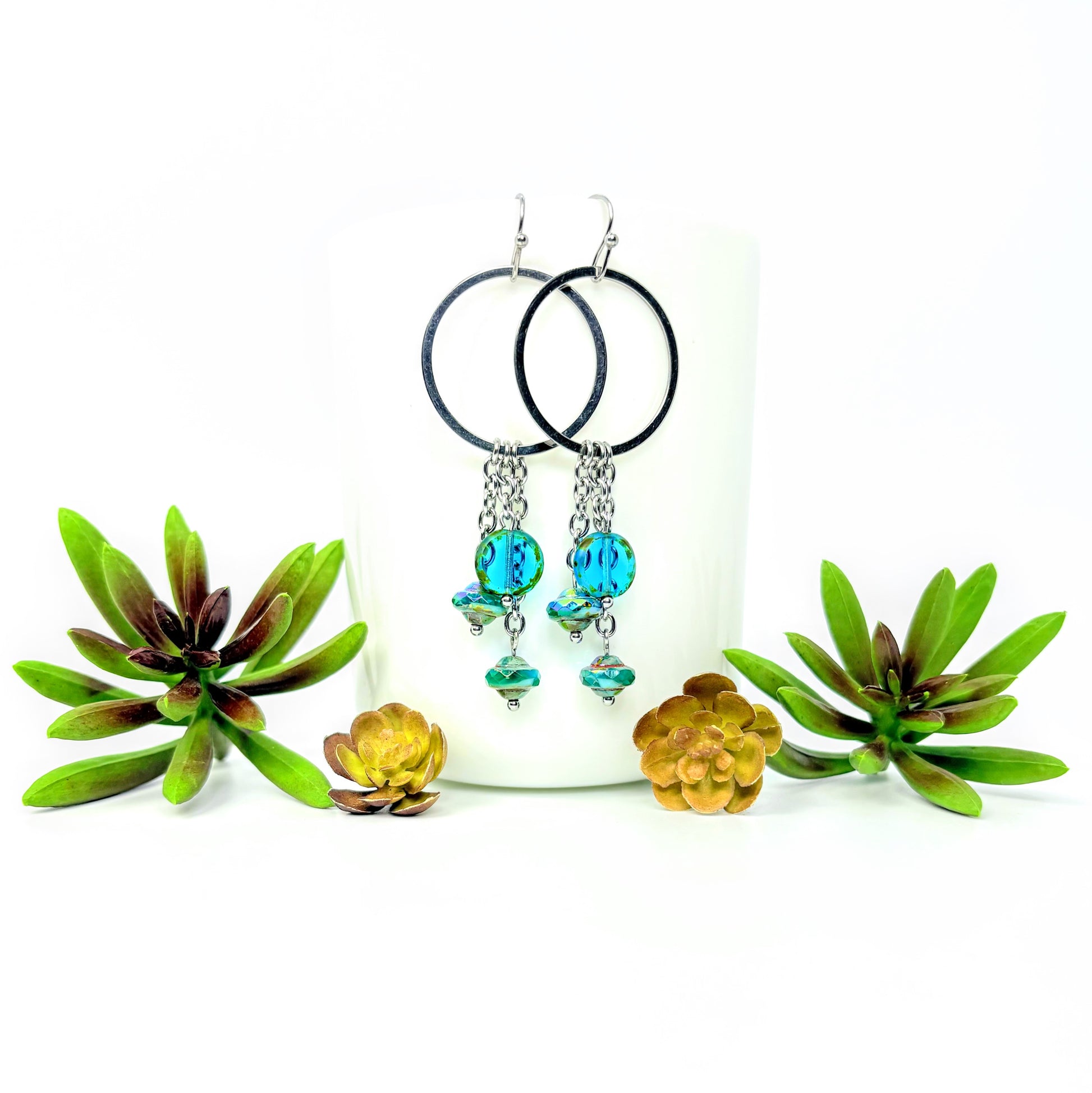 These earrings are a one of kind design variant. The variation of turquoise Czech glass beads hang from the 22 mm antique silver circles and are moderate in weight. This pair hangs from the lobes at 2 7/8 inches from hypoallergenic stainless steel hooks.